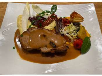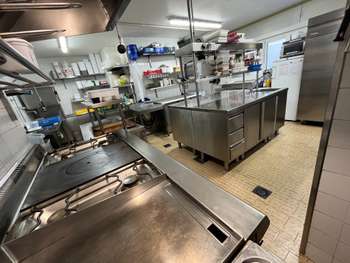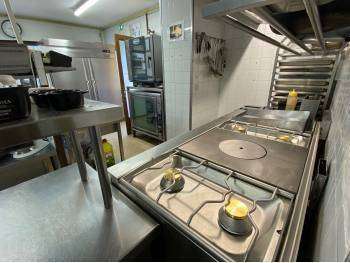 Grande et lumineuse cuisine aux normes et bien entretenue avec équipements récents, chambre froide et nombreuses réserves ; espace bar, vestiaire, logement pour personnel sur place.