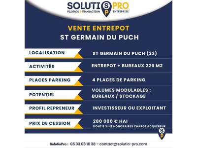 Entrepôt de 226m² à Saint-Germain-du-Puch Vente entrepôt de 226mètres carrés à Saint-Germain-du-Puch Saint-Germain-du-Puch (33) 280 000 euros HAI Le cabinet vous propose un entrepôt avec bureaux de 226 mètres carrés, idéal pour une activité artisanale, logistique légère, stockage ou un investisseur recherchant un actif polyvalent en zone d’activité. Caractéristiques principales Localisation Situé dans la zone d’activité Parc de Pique Tuile à Saint-Germain-du-Puch, un secteur dynamique et facile d’accès. Surfaces & Aménagements 226 mètres carrés comprenant : - un entrepôt modulable, - une mezzanine, - des espaces bureaux fonctionnels. Volumes adaptables selon l’activité : stockage, atelier, bureaux… Stationnement 4 places de parking privatives Potentiel Idéal artisan, TPE, activité technique, entrepreneur, ou investisseur Site permettant une exploitation immédiate ou un réaménagement selon les besoins. Profil recherché Exploitant ou investisseur souhaitant un actif sécurisé, modulable et bien positionné. Prix de cession 280 000 euros HAI Les informations sur les risques auxquels ce bien est exposé sont disponibles sur le site Géorisques : Données Financières Prix de vente : 280000 euros (1 238,94 euros/mètres carrés) Honoraires : information non communiquée par l'agence Surfaces et longueurs Surface : ENTREPOT + BUREAUX Surface de 226 mètres carrés Equipements Année de construction : 2024