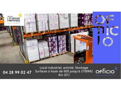 A louer local à partir de 600M2, Situé entre Bourg en Bresse et Oyonnax (Ain-01) au coeur de la région Rhône-Alpes et au sein de la Plastic Vallée. Idéal pour activité et/ou stockage. Stockage hauteur libre Min 5.5 / Max : 7.7 m, 1 portes sectionnelle par lot, Accès PL, 25 places de parking. Puissance electrique : 600KVA Option de surfaces : - Location de 600M2 (incluant surface de bureaux), - Location de 1060M2 - Location de 2090M2 - Location de 2690M2 Prix à partir de 1.7Euros HT/HC/M2/MOIS Le bien dispose également d'un logement d'environ 140m2 sur deux niveaux. Le tènement entier est également à la vente si souhaitée (mandat N°1299- Prix de vente HAI 480.000Euros Nous consulter) Nous consulter pour de plus amples informations. Honoraires cabinet à charge preneur 15% loyer annuel HT HC Toutes nos annonces ne sont pas diffusées. .