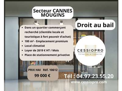 - local de 100m² Secteur Cannes/Mougins Dans un quartier commerçant recherché et fréquenté par une clientèle locale et touristique à fort pouvoir d'achat, propose droit au bail portant sur un local en parfait état, idéal pour une activité de commerce haut de gamme, ou tout métier de bouche et/ou activité de service. Offre rare de bénéficier d'une surface de vente lumineuse, bien agencée et facile à exploiter, avec une excellente visibilité, vitrines de plus de 7 mètres, avec en prime une place de stationnement privative : véritable atout pour les professionnels comme pour la clientèle. Caractéristiques du bail : Loyer annuel : 31 430 € HT HC (env. 2 619 € HT/mois) Charges + taxe foncière provisionnées : 3 152 € / an Bail commercial en cours, tous commerces sauf nuisances Surface : environ 100 m² (boutique + réserve) Local climatisé, sans aucuns travaux à prévoir Opportunités : Parfait pour activité de prêt-à-porter, accessoires, décoration, esthétique, showroom, galerie, etc. Quartier dynamique, flux régulier, clientèle fidélisée Pas de travaux Cession immédiate possible Prix de vente, honoraires du cabinet inclus, de 99 000 €. Prix de vente net vendeur de 90 000 €. Honoraires du cabinet de 10% TTC, soit 8.33% HT, à charge acquéreur.   Dossier complet adressé après validation d'un mandat de recherche avec clause de confidentialité.
