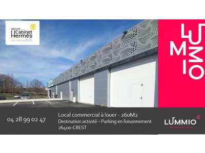 Zone d'activité à CREST, local commercial situé dans un environnement d'activité attractif et bénéficiant d'une bonne visibilité et d'un grand parking collectif. Bardage métallique en parfait état, disponible immédiatement. Bail neuf toutes activités sauf nuisance et activités avec risque incendie. Surface : 260 m² Largeur façade sur parking : 11 m Faîtage : 9.6 m / Point bas 6 m Porte sectionnelle grande largeur, grande hauteur 4*6 Loyer mensuel HT/HC : 1.800 Euros. Charges locatives annuelles : 2.600 Euros (taxe foncière incluse) Dépôt de garantie : 3 mois de loyer HT HC Honoraires cabinet à charge vendeur : 20% loyer annule HC HC Rare sur le secteur, n'hésitez pas à nous consulter. D'autres surfaces sont disponibles sur le tènement. D'autres biens sur le site internet du cabinet.