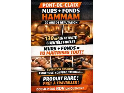 Situé sur le secteur de Pont-de-Claix, ce hammam en activité constitue une opportunité rare d'acquisition d'un établissement installé depuis plus de 20 ans, bénéficiant d'une excellente notoriété locale et d'une clientèle fidèle.